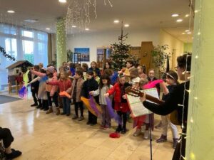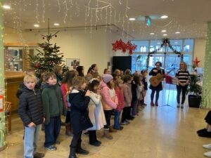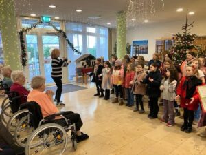 Am 12. Dezember 2025 besuchte der Schulchor der Marien-Schule unter der Leitung von Frau Wittmann und Frau Trzaska das DRK-Seniorenzentrum an der Kölner Landstraße. Viele Bewohnerinnen und Bewohner hatten sich im Foyer versammelt und freuten sich auf die Martins- und Adventlieder. Los ging es mit einem mehrsprachigen Begrüßungslied, das als Kanon gesungen wurde. Es folgten unter die Haut gehende Lieder wie „Maria durch ein Dornwald ging“ und „Martinus als ein Heide“. Einen fröhlichen Abschluss bildete das Lied „Lichterkinder“, bei sich Gesang und Rappen abwechselten. Leiter Oliver Marcial und die Seniorinnen und Senioren waren sichtlich begeistert. Auch den Chorkindern hat der Auftritt große Freude bereitet. Als Dankeschön gab es einen riesigen Weckmann, der direkt im Anschluss mit großem Appetit verspeist wurde.