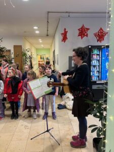 Besonders schön waren die vielen Martinslieder, die von Frau Wittmann und Herrn Krause mit Gitarren begleitet wurden. Den Schluss bildete das Lied „Lichterkinder“, das vom Erstklässler bis zur Viertklässlerin fröhlich mitgesungen wurde.