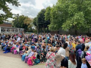 Was für ein aufregender Tag! Am 28. August 2025 wurden unsere Wölfe (Klasse 1a), Elefanten (Klasse 1b) und Pinguine (Klasse 1c) im Rahmen einer kleinen Feier auf dem Schulhof eingeschult. Begrüßt wurden die Kinder und ihre Familien u.a. von Frau Nicolay, Lehrkräften, OGS-Mitarbeitenden und Kindern der Klassen 2a, 2b und 2c, die das Lied „Schule ist mehr“ vortrugen.
