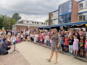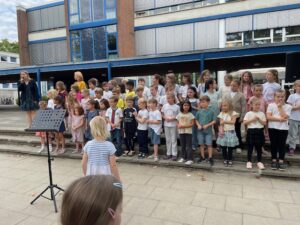 Traditionsgemäß sang das Kollegium zum Abschied das Lied „Wir sagen euch Tschüss“, das von Klatschen und Winken begleitet wurde.