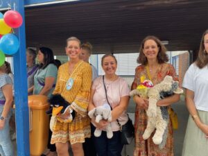 Dann ging es los: Alle Kinder wurden klassenweise nach vorne gerufen und erhielten zur Begrüßung ein kleines, buntes Windrad. Direkt im Anschluss gingen die Kinder mit ihren Klassenlehrerinnen und den Klassentieren Akele, Balu und Ole zu ihrer ersten Schulstunde in den Klassenraum. Währenddessen konnten sich die Familien bei Kaffee und Kuchen auf dem Schulhof unterhalten. Nach der Schulstunde hatten alle Gäste Gelegenheit, die neuen Klassenräume aufzusuchen und Fotos zu machen.