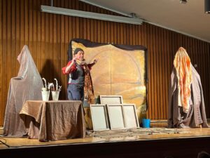 In der Aula wurde das geisterhafte Mini-Musical „Villa Spooky“ vom Chor der Marien-Schule unter der Leitung von Frau Trzaska und Frau Wittmann aufgeführt. Zu beiden Vorstellungen kamen viele Gäste, um die großartige Leistung der Sängerinnen und Sänger zu bestaunen. Das Musical erzählt von dem kleinen Vampir Bisso, der in einer Villa lebt, die verkauft werden soll. Bisso und seine Fledermaus- und Geisterfreunde schmieden einen pfiffigen Plan und schlagen die interessierten Käufer in die Flucht. So können sie weiter in der Villa wohnen. Am Ende gab es einen begeisterten Applaus!