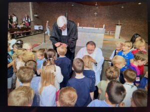 Traditionell gehen wir mit allen 12 Klassen unserer Schule an Aschermittwoch in den Schulgottesdienst in der Benden-Kirche. Heute zelebrierte Herr Kaplan Cenoz Larrea mit uns den Wortgottesdienst, der an die Vergänglichkeit des Lebens erinnert und den Übergang in die Fastenzeit markiert. Besonders aufregend war für viele Kinder die Flamme, die sich beim Verbrennen der Palmzweige bildete. Zum Ende bekamen die Kinder und die Lehrkräfte ein Aschekreuz auf die Stirn: „Kehre um und glaube an das Evangelium!“