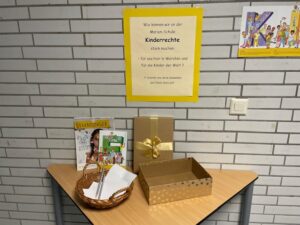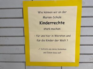 Die Marien-Schule hat den Weltkindertag am 20. September 2025 zum Anlass genommen, unsere Schülerinnen und Schüler zu bitten, ihre aktuellen Vorschläge und Ideen in Bezug auf Rechte und Bedürfnisse von Kindern zu sammeln. Ausgehend von einem Wortgottesdienst für die Dritt- und Viertklässler steht nun eine Box mit Zetteln und Stiften im Atrium, damit die Kinder unserer Schule ihre Gedanken zu Kinderrechten in Wersten und für die Kinder in der Welt aufschreiben können.